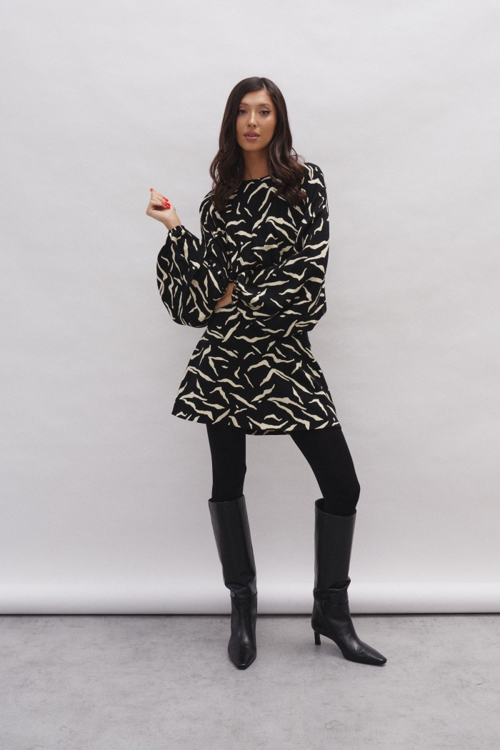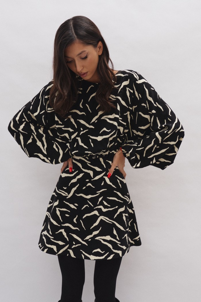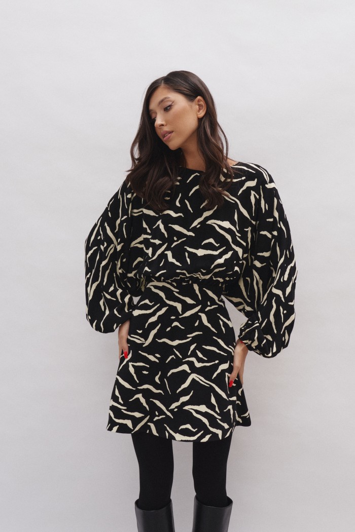 Платье полуприлегающего силуэта выполнено из полотна с контрастным принтом.