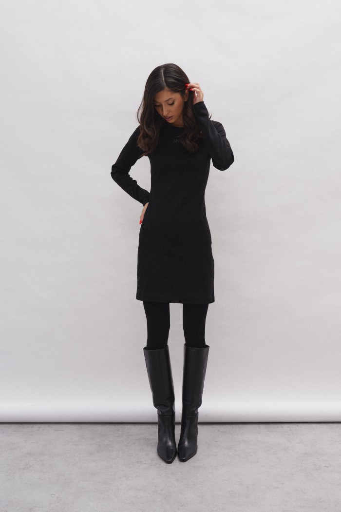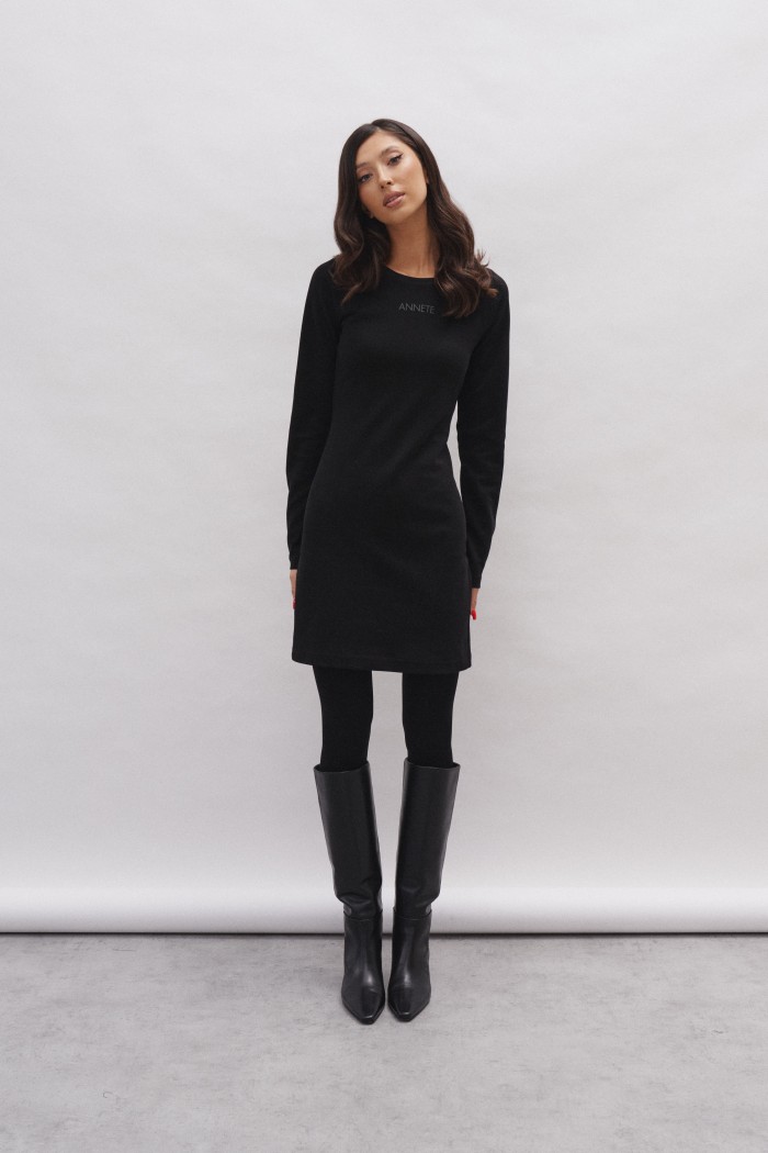 Базовое платье прилегающего силуэта выполнено из трикотажного полотна черного цвета.