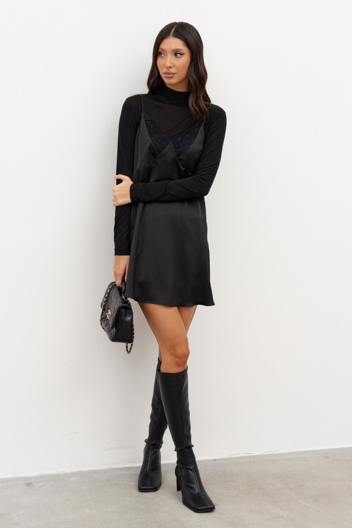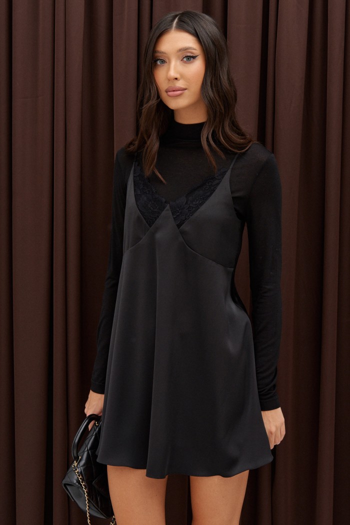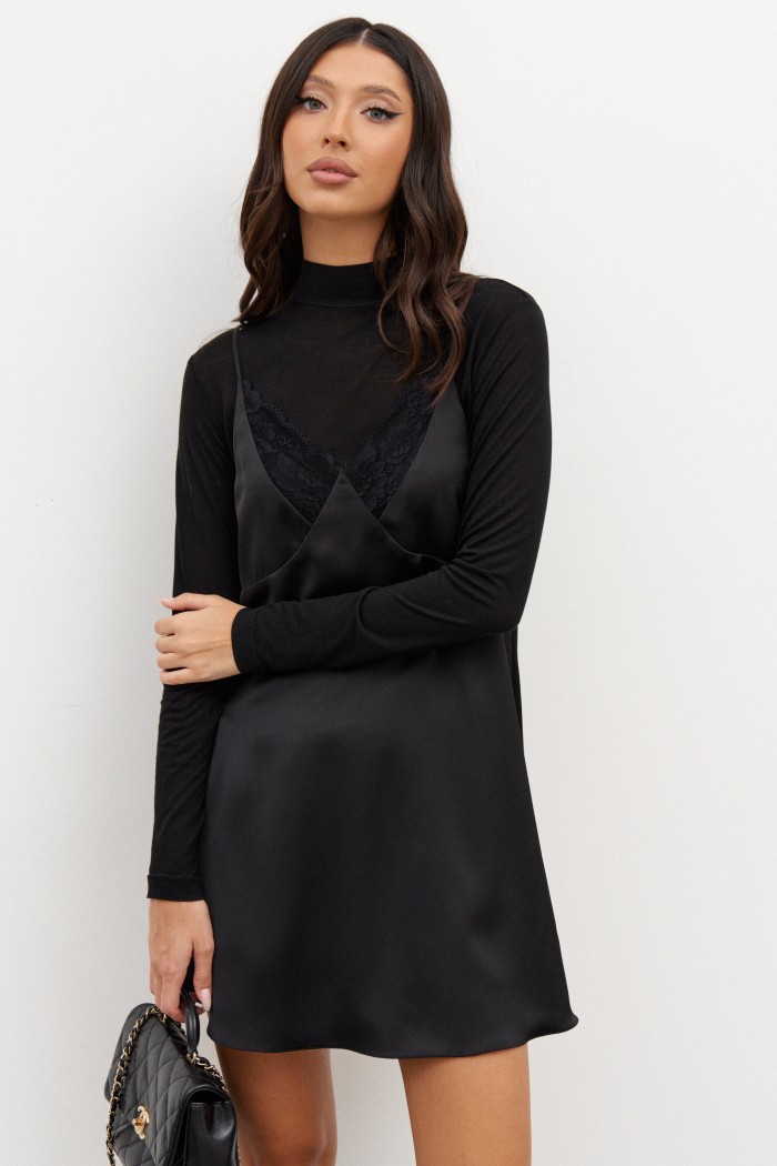 Платье-мини на бретелях. Выполнено из сатиновой ткани. Бретели регулируемые. Лиф отрезной фигурный с кружевом. Лиф двойной. В юбке платья есть подклад. Спинка открытая, с круглым вырезом. Длина по центру спинки 42 см, длина по боковому шву 59 см