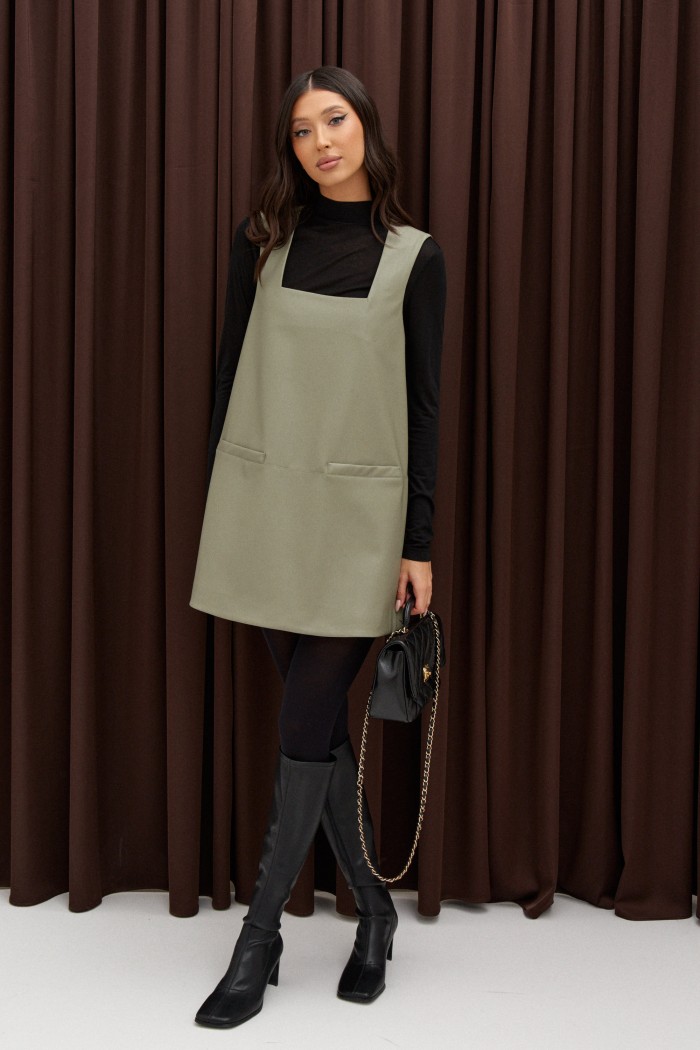 Платье-мини из эко-кожи. А-образный силуэт. Вырез горловины квадратный. Подрез ниже линии талии. В подрезе ли́сточки (нефункциональные). Есть подклад. Длина спинки платья 79 см