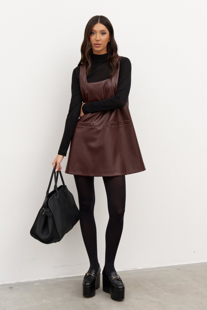 Платье-мини из эко-кожи. А-образный силуэт. Вырез горловины квадратный. Подрез ниже линии талии. В подрезе ли́сточки (нефункциональные). Есть подклад. Длина спинки платья 79 см