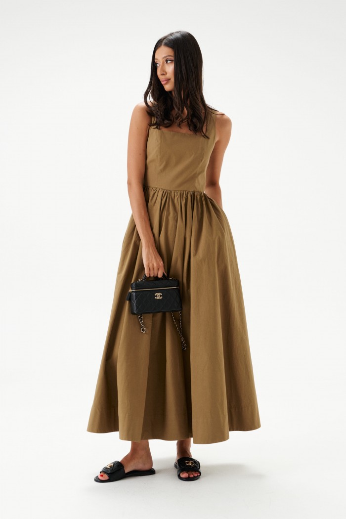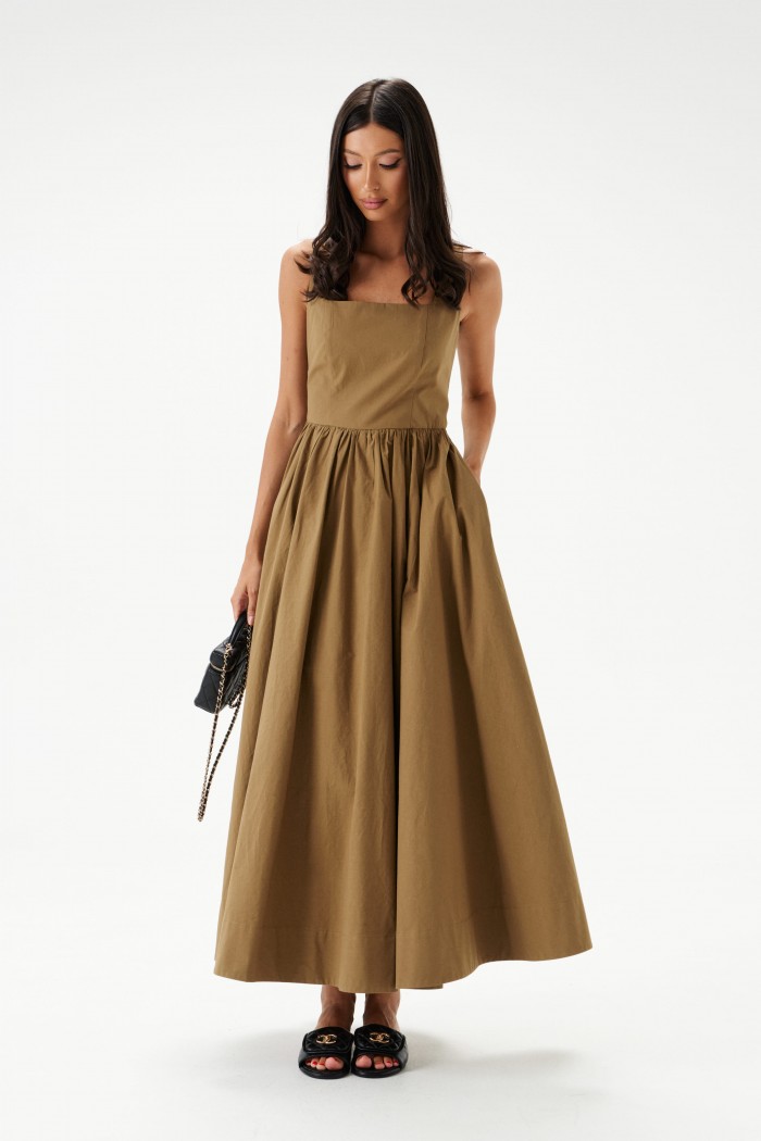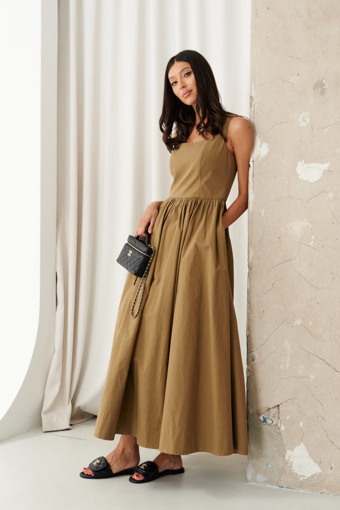 Платье из хлопкового полотна. Характеристики: Широкие бретели, юбка свободного кроя со сборкой, в боковых швах карманы, подкладка. Спинка закрытая, застежка - скрытая молния посередине спинки. Длина изделия 115см.