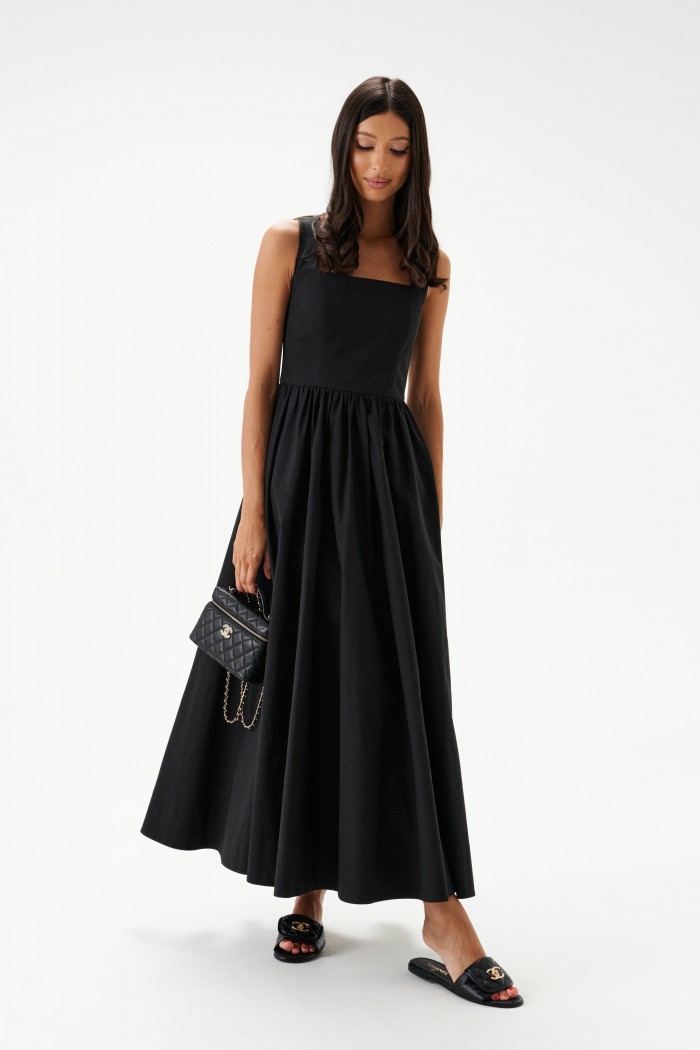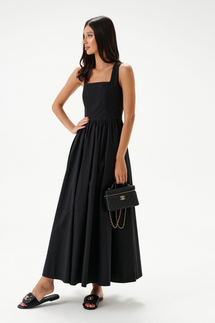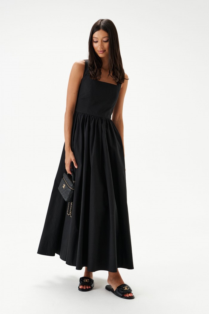 Платье из хлопкового полотна черного цвета. Характеристики: Широкие бретели, юбка свободного кроя со сборкой, в боковых швах карманы, подкладка. Спинка закрытая, застежка - скрытая молния посередине спинки. Длина изделия 115см.