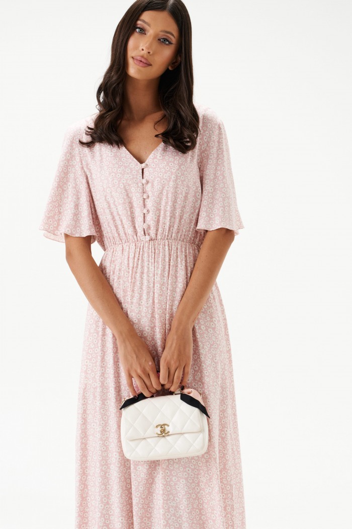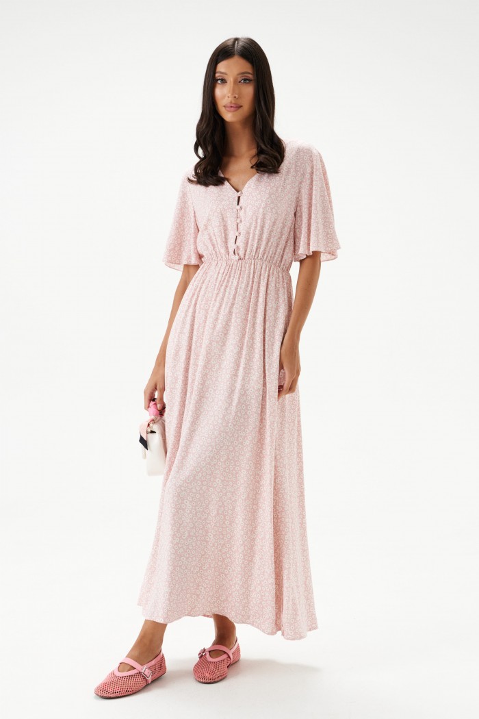 Платье полуприлегающего силуэта выполнено из нежно-розовой ткани с цветочным принтом.