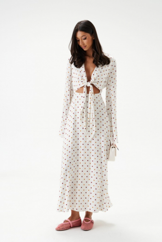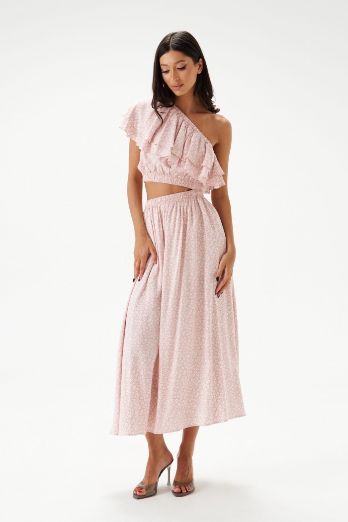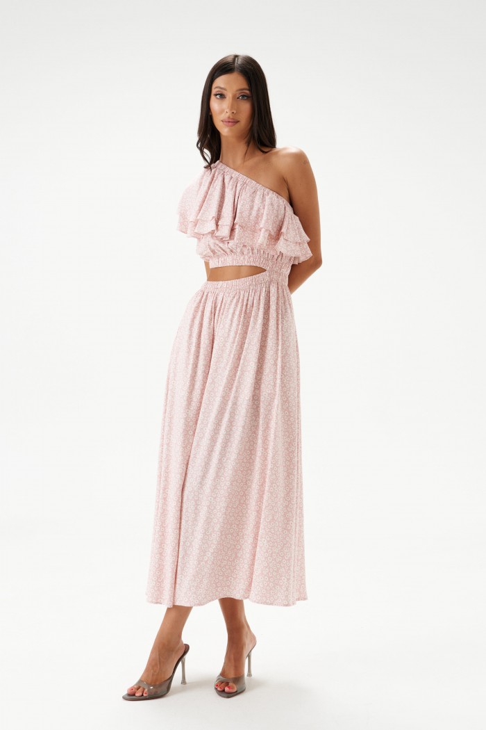 Платье с открытым плечом выполнено из розового полотна с цветочным принтом.