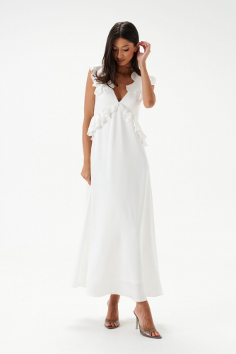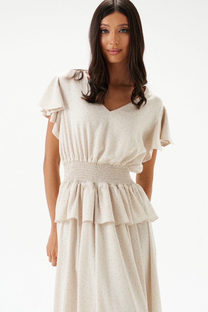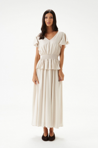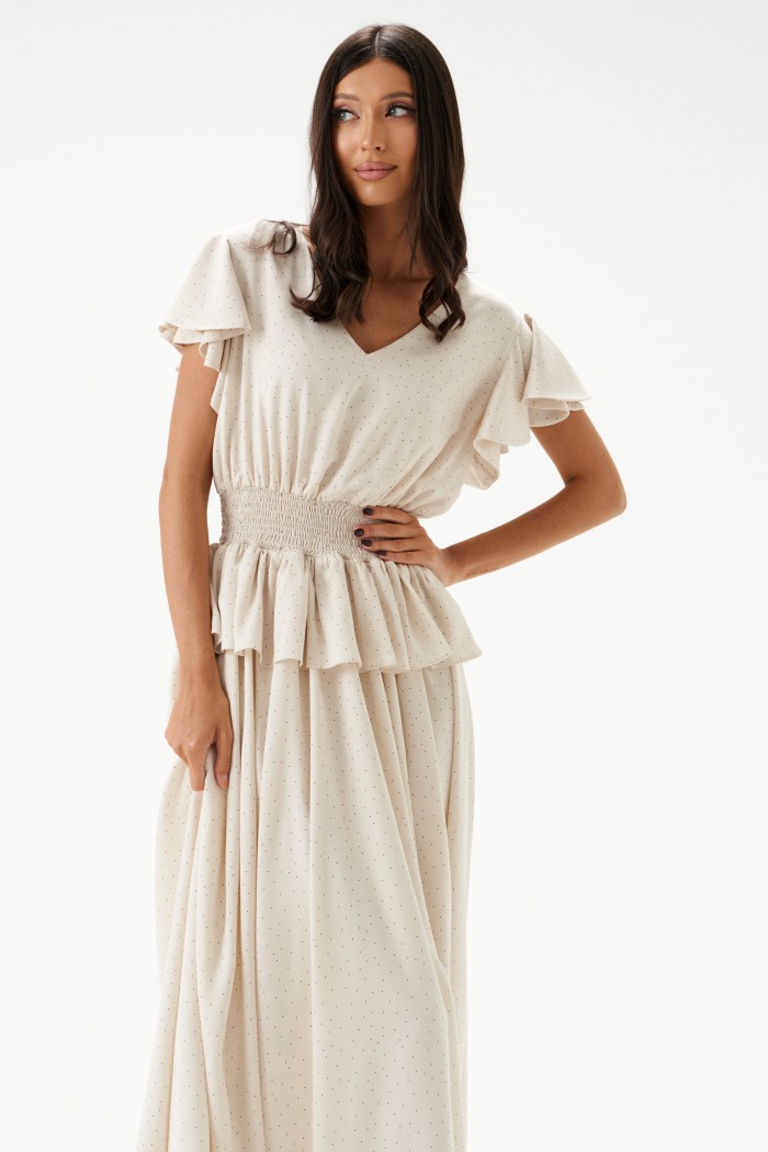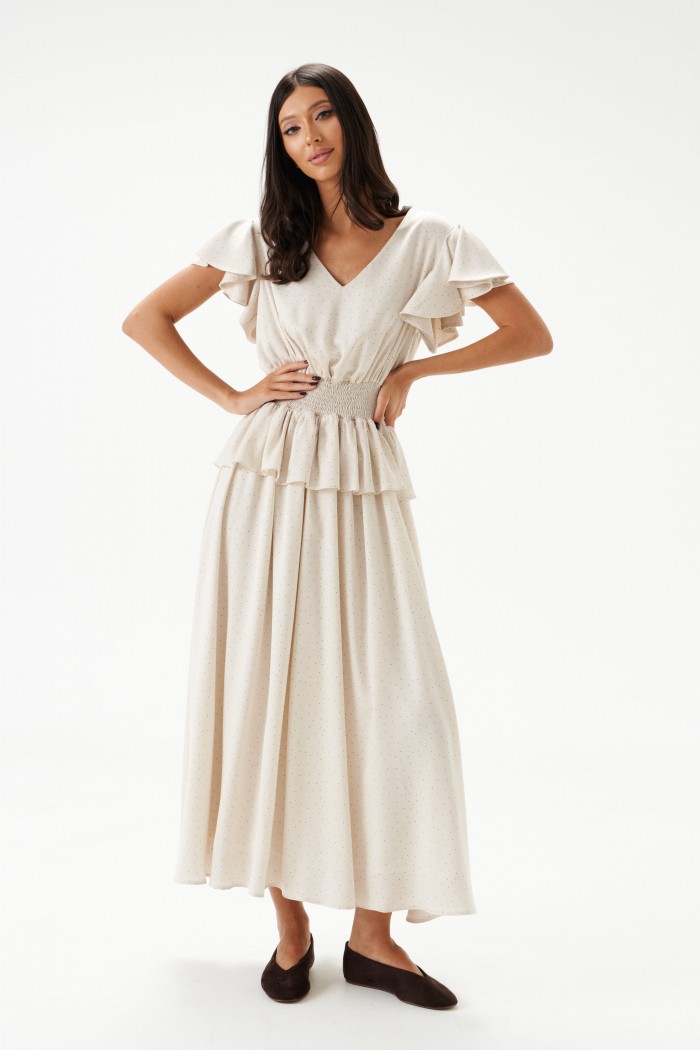 Платье-макси. Выполнено из мягкой струящейся ткани бежевого цвета в мелкий горошек. С подкладкой. Вырез горловины V-образный. Рукав-волан втачной. Спинка закрытая. Пояс – венгерка. От пояса баска-волан. Юбка свободного кроя, с подкладкой. Платье без застёжки. Длина платья 129 см