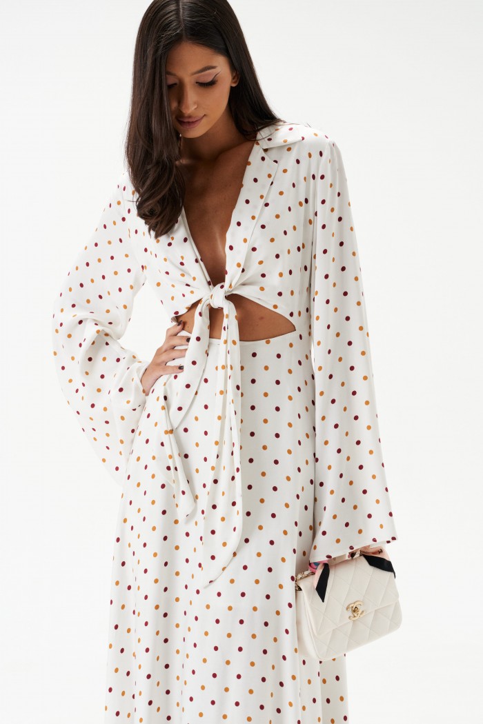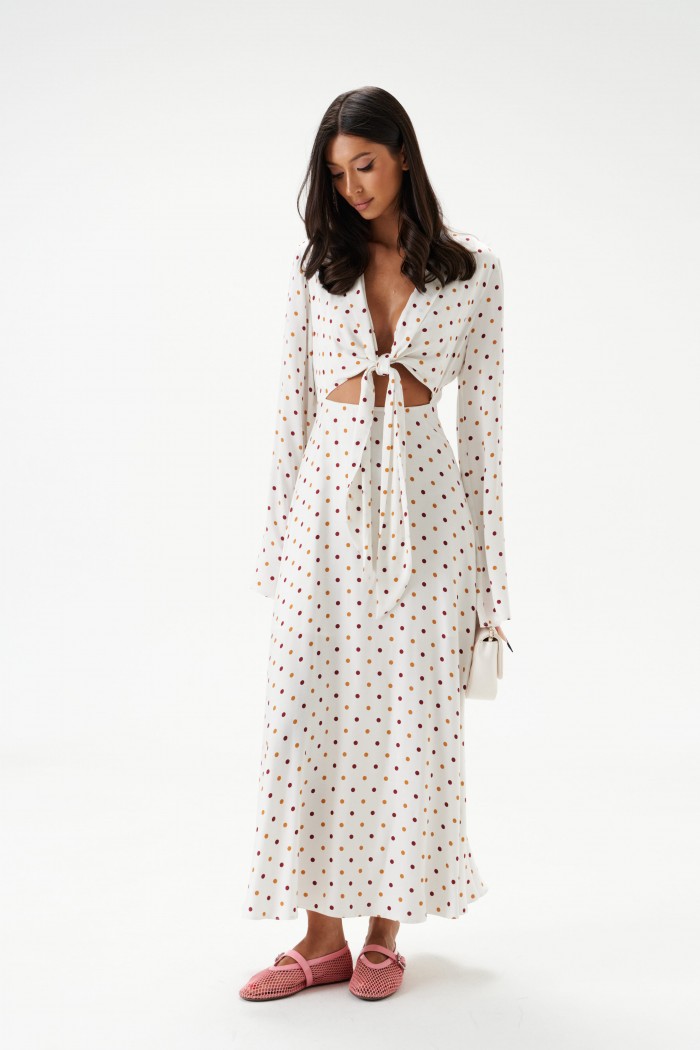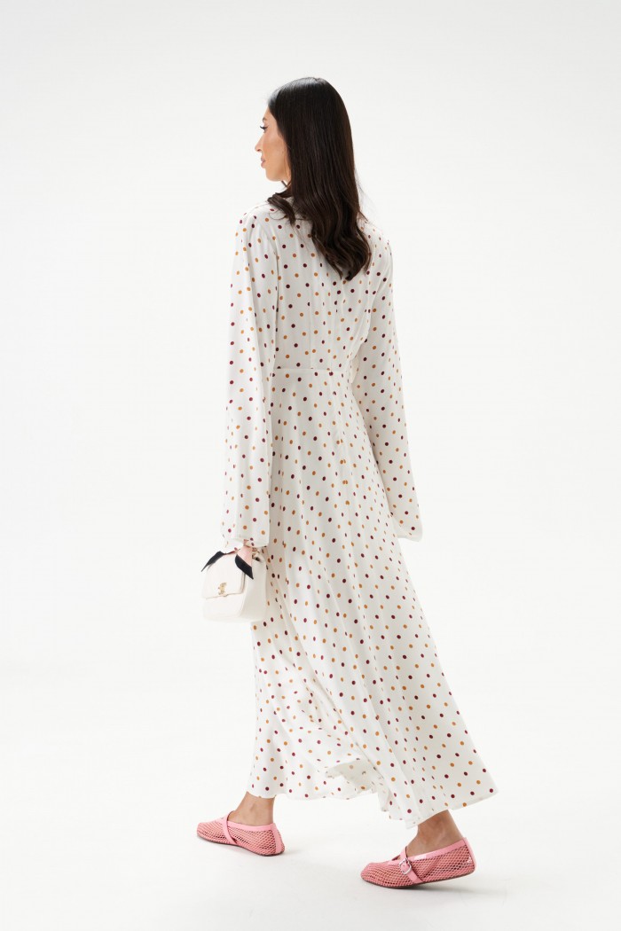 Платье полуприлегающего силуэта, выполнено из текстильного полотна в горох.