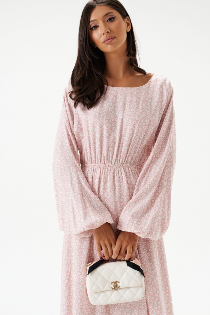 Платье - миди полуприлегающего силуэта выполнено из розового полотна с белым цветочным принтом. Горловина овальная. Отрез ниже талии на резинке. По лифу спинки вырез с завязками. Рукав  спущенный, присборен на резинку. Длина платья 132 см, длина рукава 76 см