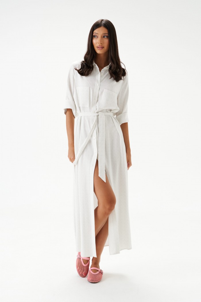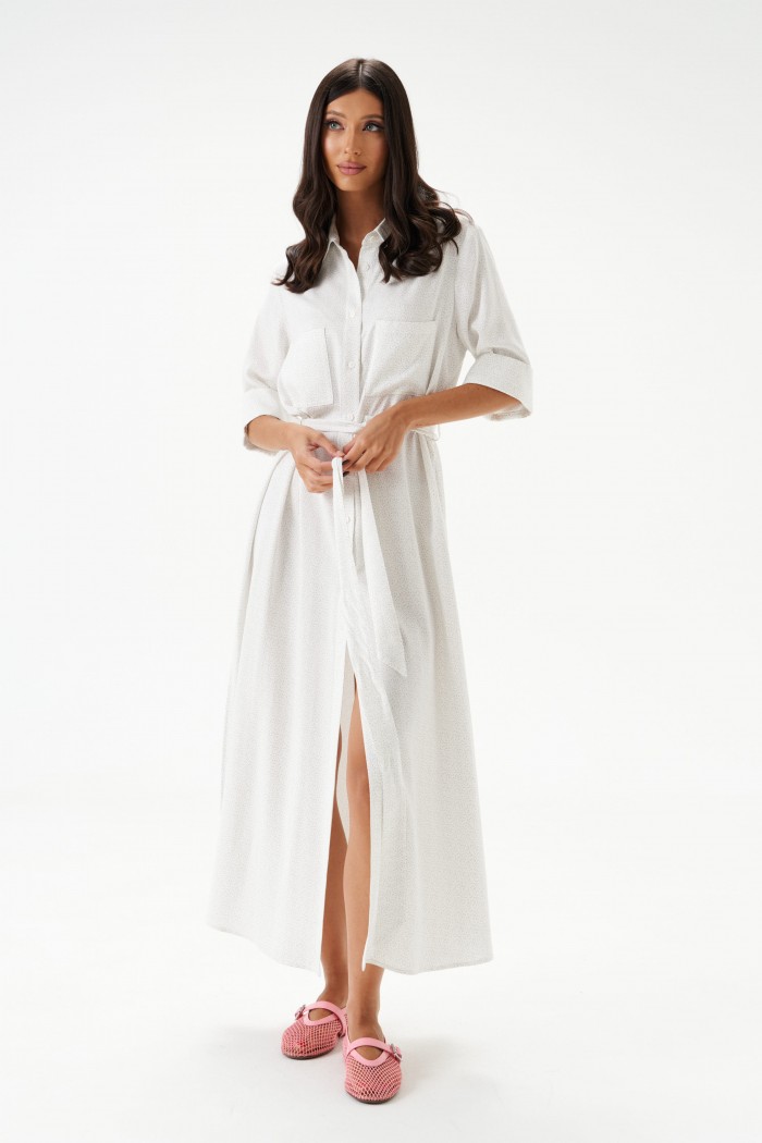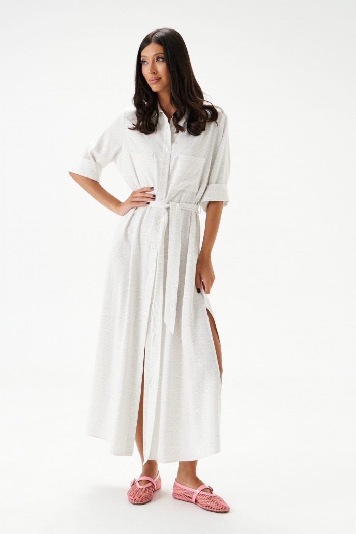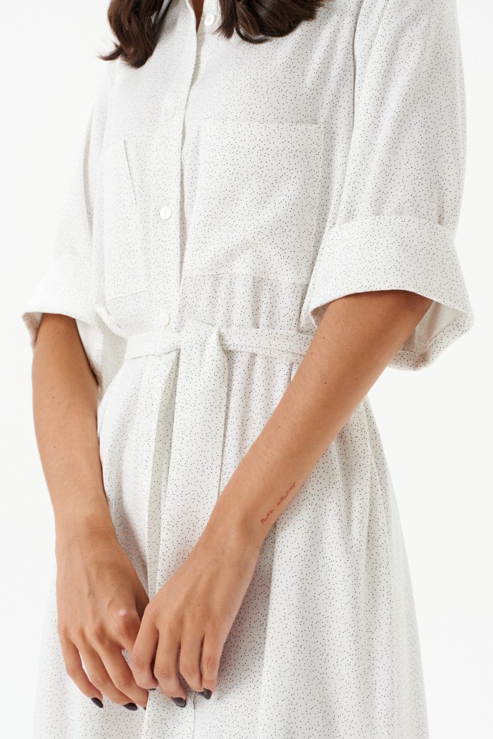 Платье прямого свободного кроя выполнено из текстильного полотна в мелкий горошек.