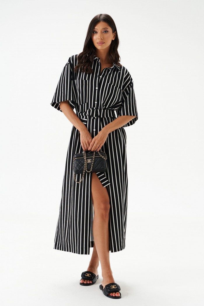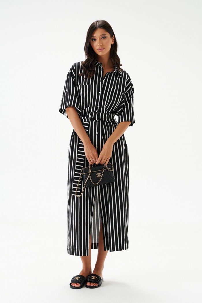 Платье прямого силуэта свободного кроя,  выполнено из натурального полотна - лен, черного цвета в вертикальную полоску белого цвета. Рукав укорочен, спущен. По переду два функциональных кармана. Талия фиксируется поясом. Отложной воротник. Центральная застежка на петли - пуговицы. В боковых швах разрезы 55 см. Длина спинки 129 см, длина рукава от края горловины 45 см