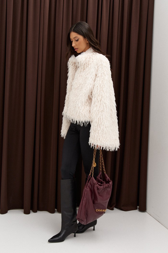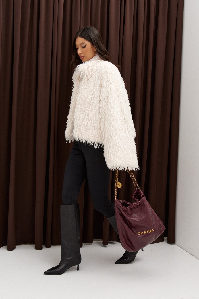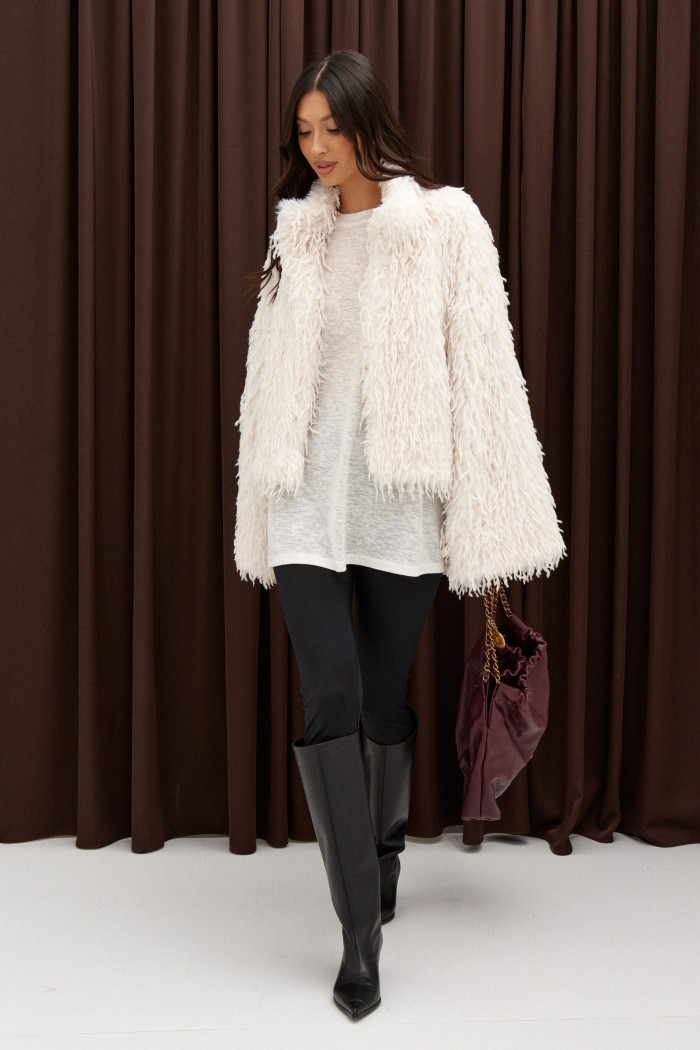 Полупальто белого цвета, выполнено из фактурного мохнатого полотна. Характаристики: укороченный свободный крой, воротник-стойка, застёжка центральная крючок, на подкладке, рукав широкий спущеный. Длина по спинке 51 см, длина рукава от горловина 80 см.