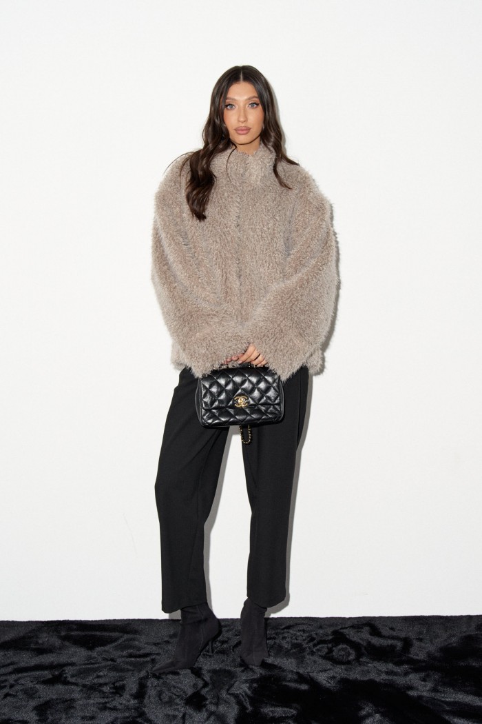 Укороченный жакет прямого кроя, выполнено из фактурного мехового полотна сеорого цвета. Характеристики: прямой крой, подкладка, застёжка центральная крючки, рукав свободного кроя спущен по низу притачная манжета, в боковых швах карманы. Длина по спинке 65 см, длина рукава от края горловины 79см.