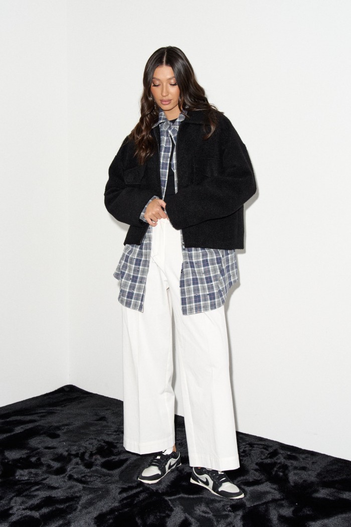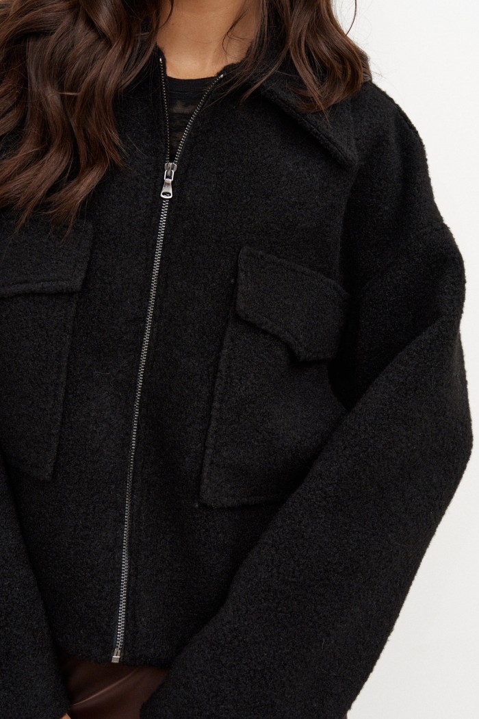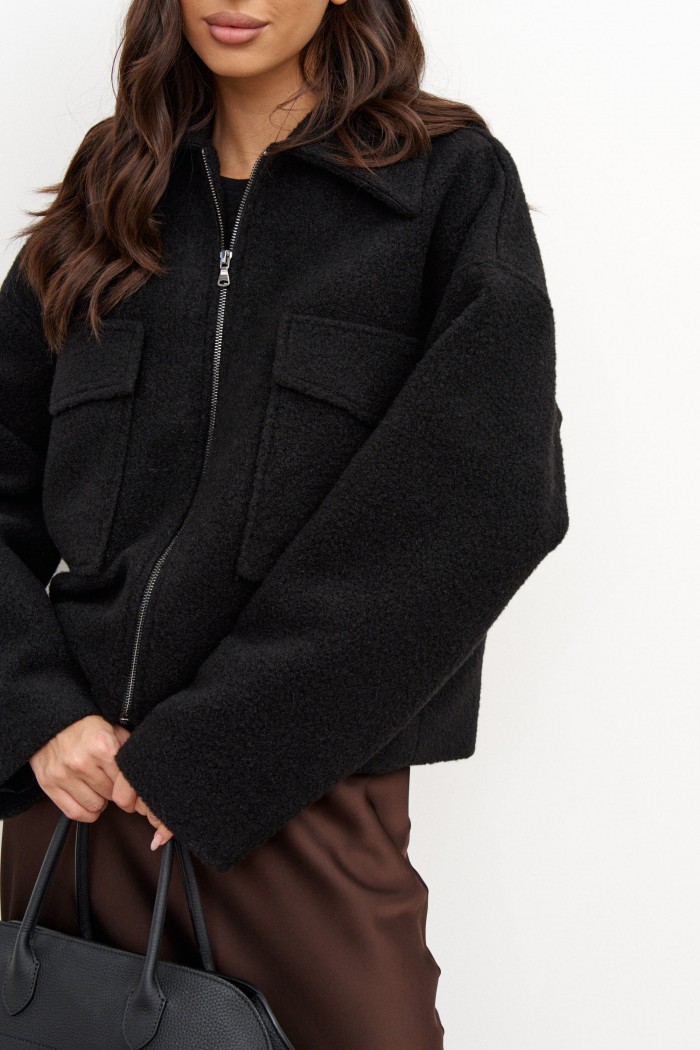 Полупальто прямого свободного кроя выполнен из полотна черного цвета с ворсистой текстурой. Характеристики: овальный вырез горловины, застежка центральная молния,рукав спущеный прямой, по переду функциональные карманы с клапанами. Длина по спинке 57 см, длина рукава от края горловины 79 см.