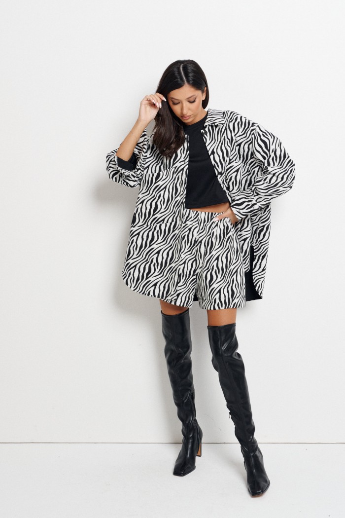 Шорты прямого кроя выполнены из полотна с анималистическим контрастным принтом .