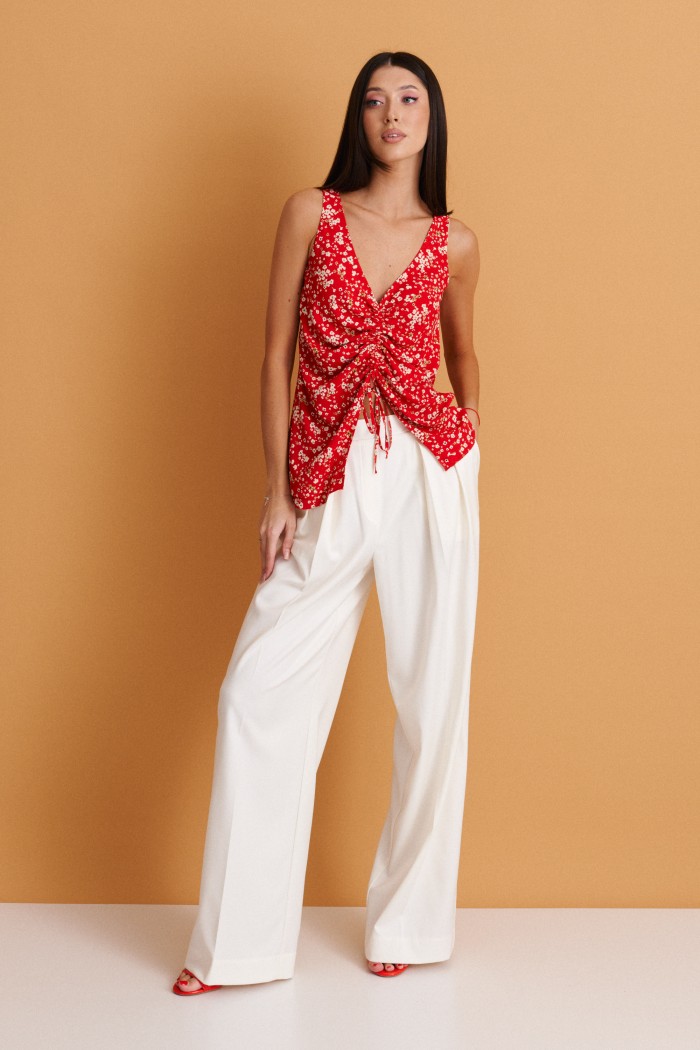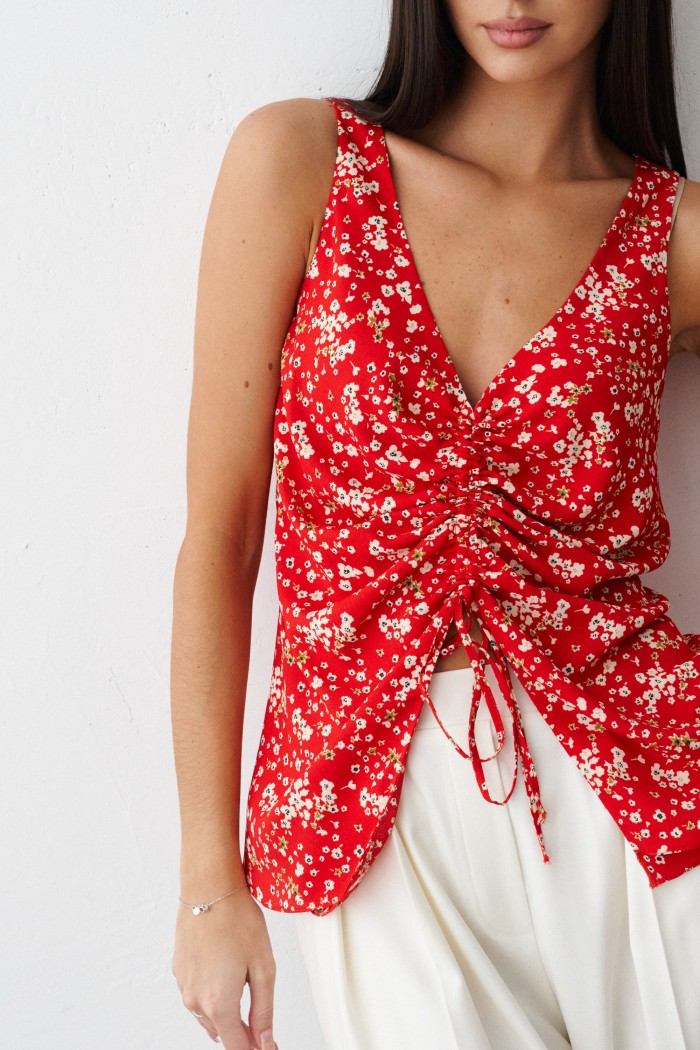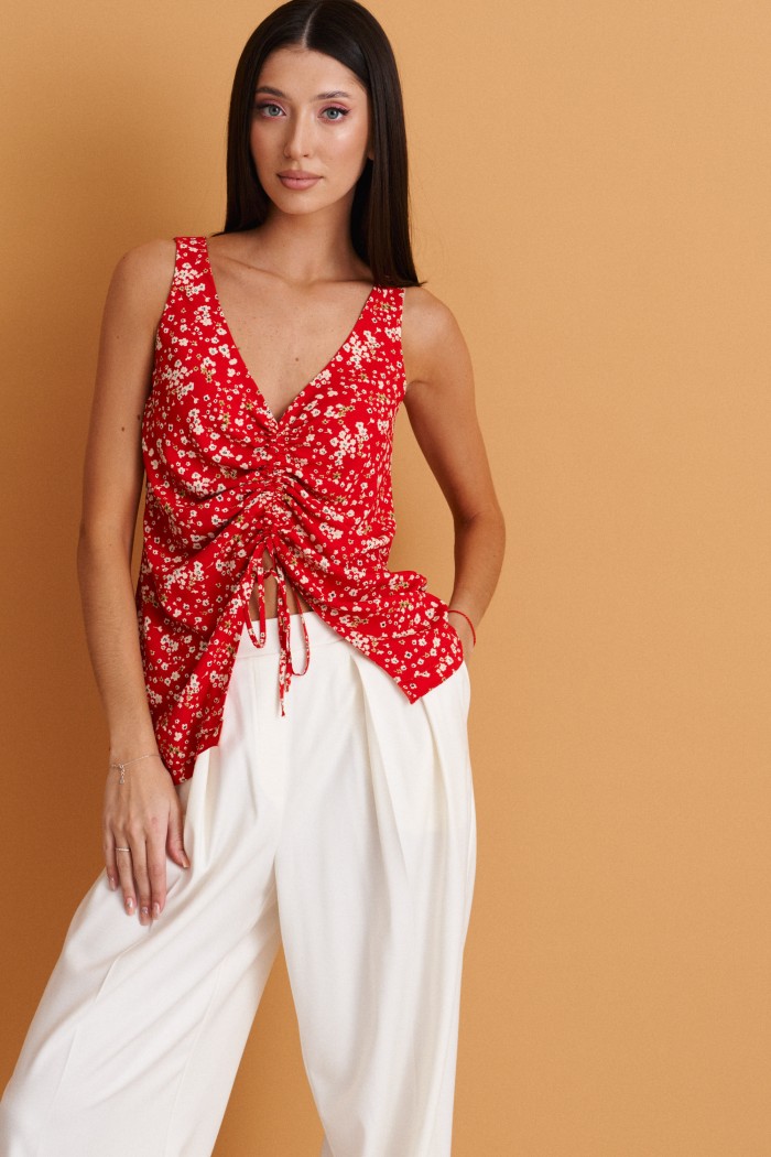 Блуза прямого кроя с декоративной сборкой выполнена из полотна красного цвета с мелким цветочным принтом.