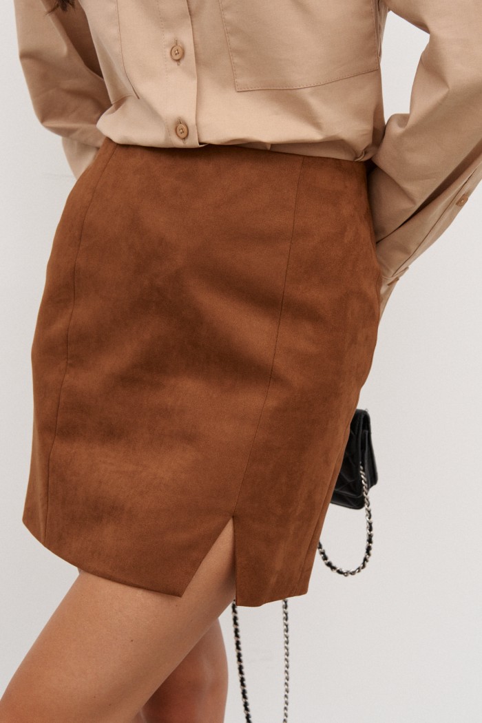 Юбка выполнена из мягкой замшевой ткани цвета шоколад (имитация замши). Характеристики: подкладка, пояс стабильный, по передней части рельефы, левый заканчивается разрезом 8 см. Длина 43 см.
