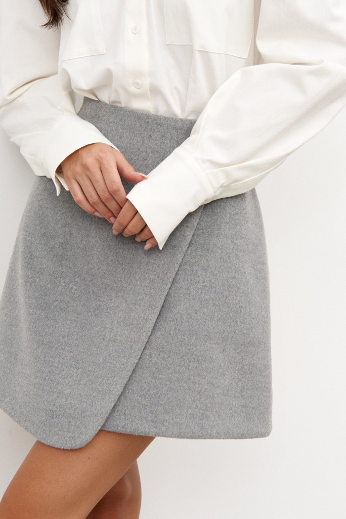 Юбка трапеция на запа́х выполнена из полотна серого цвета. Харектеристики: силуэт трапеция, подкладка, скрытая застежка в виде крючка. Длина 43 см.