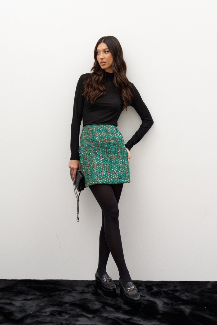 Юбка-мини. Выполнена из твида с пайетками. А-образный силуэт (трапеция). Пояс стабильный, линия талии на обтачке. Есть подклад. Застежка потайная тесьма молния в среднем шве заднего полотна. Длина по боковому шву 44 см