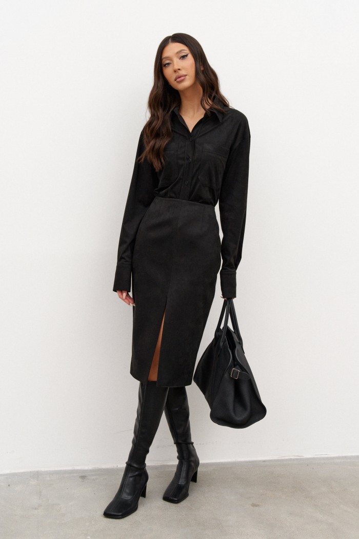 Юбка. Выполнена из эко-замши. Полуприлагающий силуэт. Есть подклад. Пояс стабильный, на обтачке. По передней и задней чаасти изделия есть выточки. В среднем шве передней чаасти изделия разрез 32 см. Застёжка потайная тесьма молния в среднем шве задней части изделия. Длина юбки 67 см