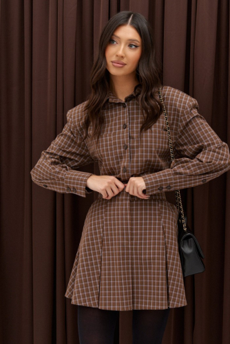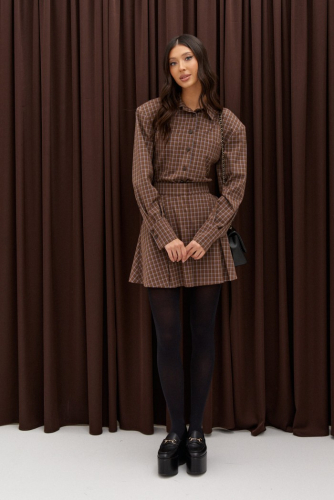 Юбка-мини, трапеция. Выполнена из хлопкового полотна кофейного цвета в клетку. Харектеристики: силуэт трапеция, пояс стабильный с шлевками, скрытая застежка на молнии и крючках, декоративные складки, в боковых швах карманы. Длина 42 см.