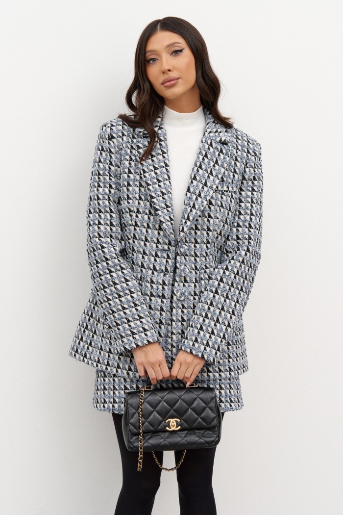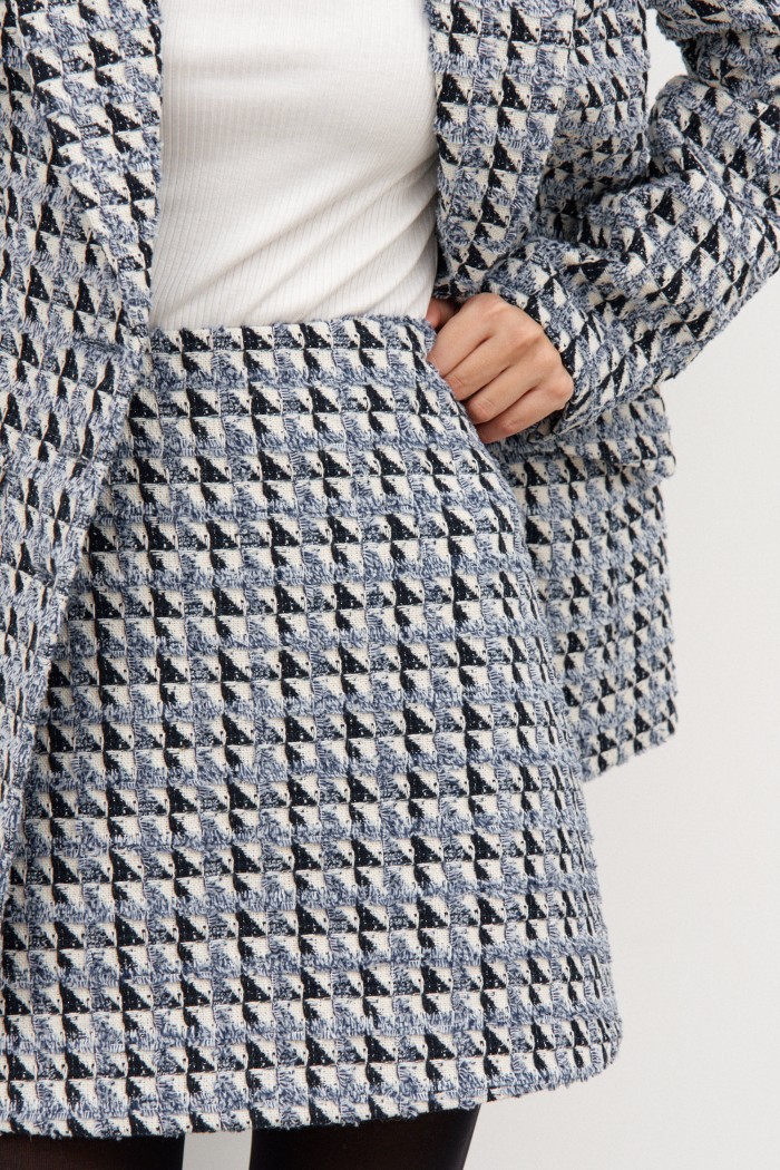 Юбка А-образного силуэта длины мини, выполнена из синего полотна твид с пайетками. Характеристика: подкладка, в среднем шве заднего полотнища юбки обработана потайная застежка молния, пояс юбки обработан обтачкой. Длина изделия 45см.