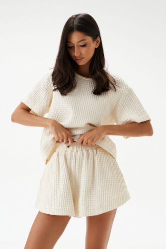 Юбка-мини прямого кроя. Выполнена из текстильного полотна молочного цвета в полоску. Характеристики: подскладка, выточки спереди и сзади изделия, сзади потайная молния, накладные функциональные карманы сзади. Длина юбки 44 см.