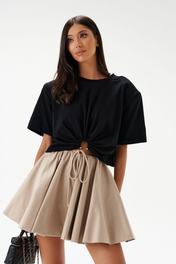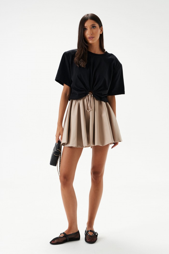 Юбка-баллон, выполнена из текстильной ткани песочного цвета. На хлопковом подкладе.Расширенная к низу. Пояс на резинке со шнурком-завязкой. Длина 38 см