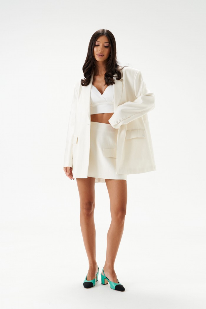 Юбка-мини. Выполнена из текстильного полотна в жемчужном цвете. Силуэт - трапеция, стабильный пояс, есть подкладка. Застежка - молния в шве заднего полотна изделия. Длина 38 см