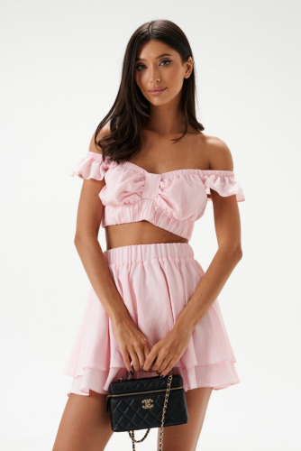 Юбка-мини, выполнена из текстильной ткани нежно-розового цвета. Без подкладки. Характеристики:  двуслойная, пояс на  резинке.  Длина  изделия  40 см.