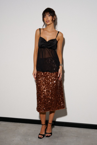 Юбка прямого кроя выполнена из бархатного полотна серого цвета с пайетками. Характеристики: прямой крой, подкладка, пояс на резинке. Длина 80 см.
