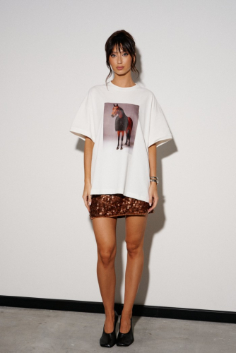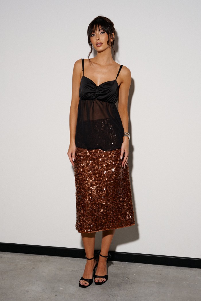 Юбка прямого кроя выполнена из бархатного полотна светло-коричневого цвета с пайетками. Характеристики: прямой крой, подкладка, пояс на резинке. Длина 80 см.