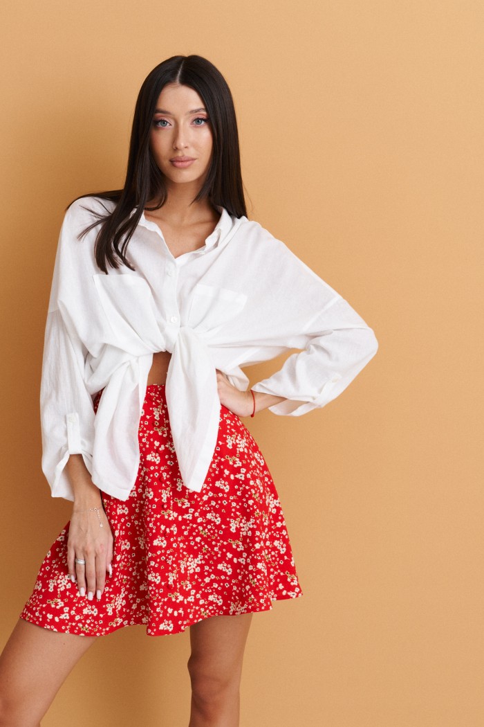 Юбка полуприлегающего силуэта выполнена из красноного полотна с цветочным принтом.