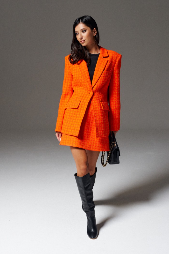 Миниатюрная юбка полуприлегающего силуэта выполнена из фактурного полотна.