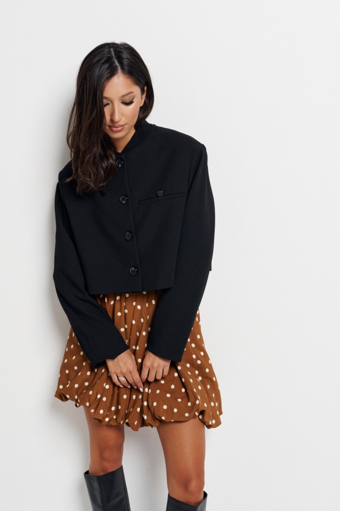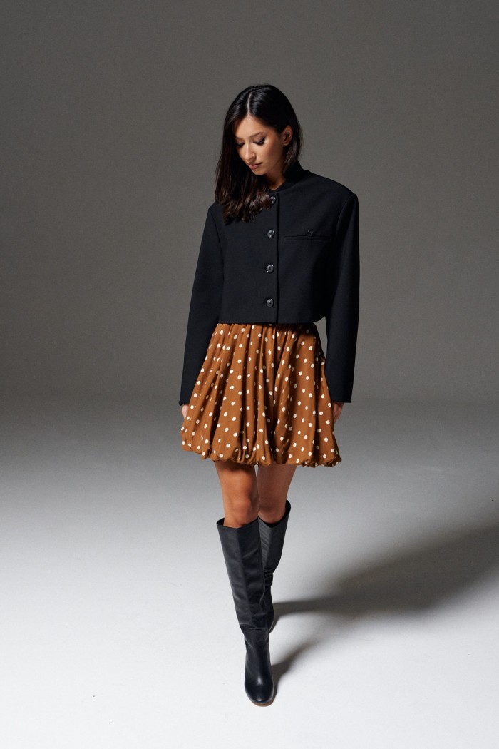 Стильная мини юбка выполнена из полотна шоколадного цвета с принтом горох.
