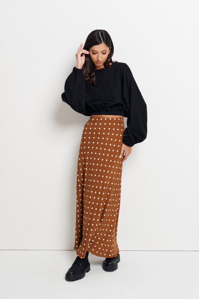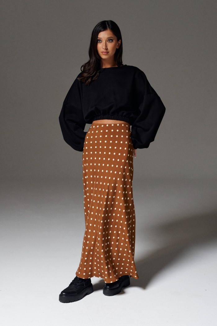 Стильная юбка полуприлегающего силуэта выполнена из ткани цвета молочный шоколад с принтом горох.