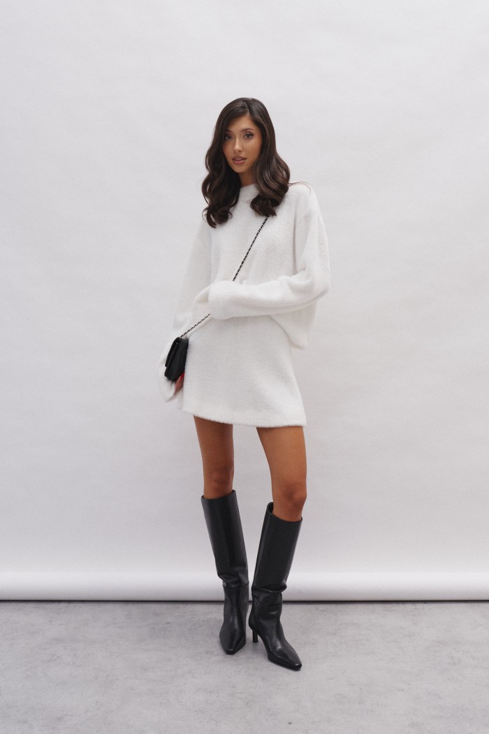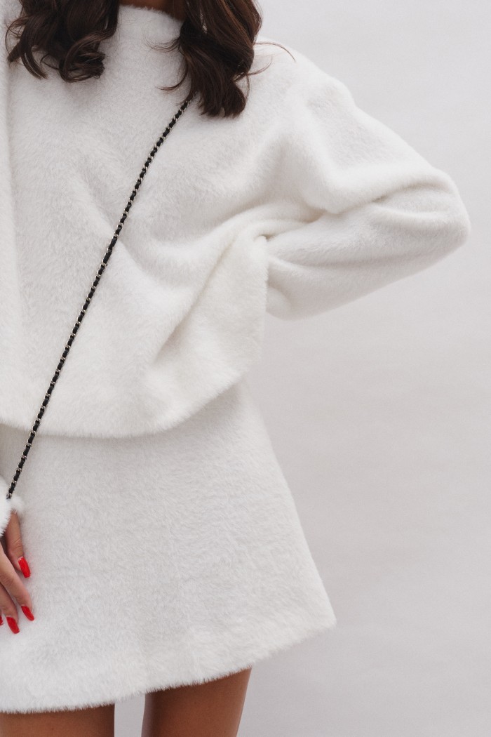 Юбка прямого кроя выполнена из мягкого фактурного полотна белого цвета.
