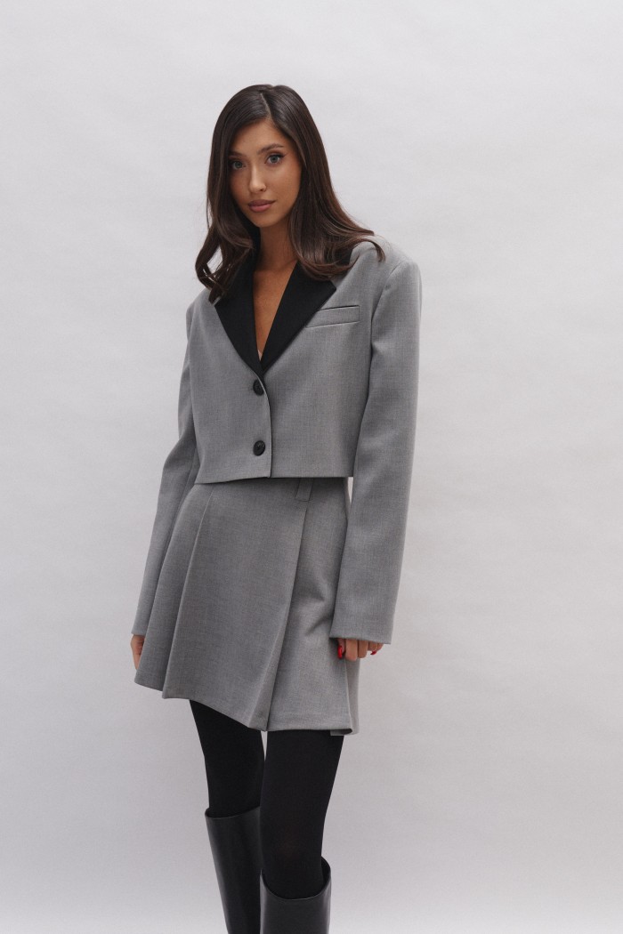 Миниатюрная стильная юбка полуприлегающего силуэта выполнена из ткани серого цвета.