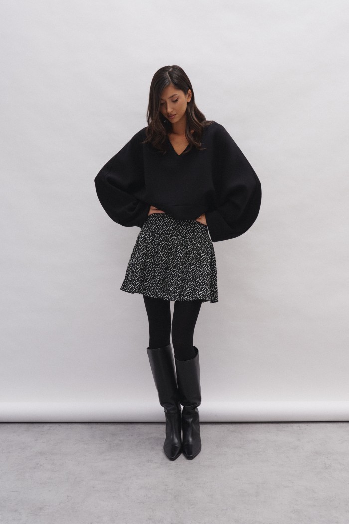 Юбка полуприлегающего силуэта выполнена из ткани черного цвета в цветочный принт.