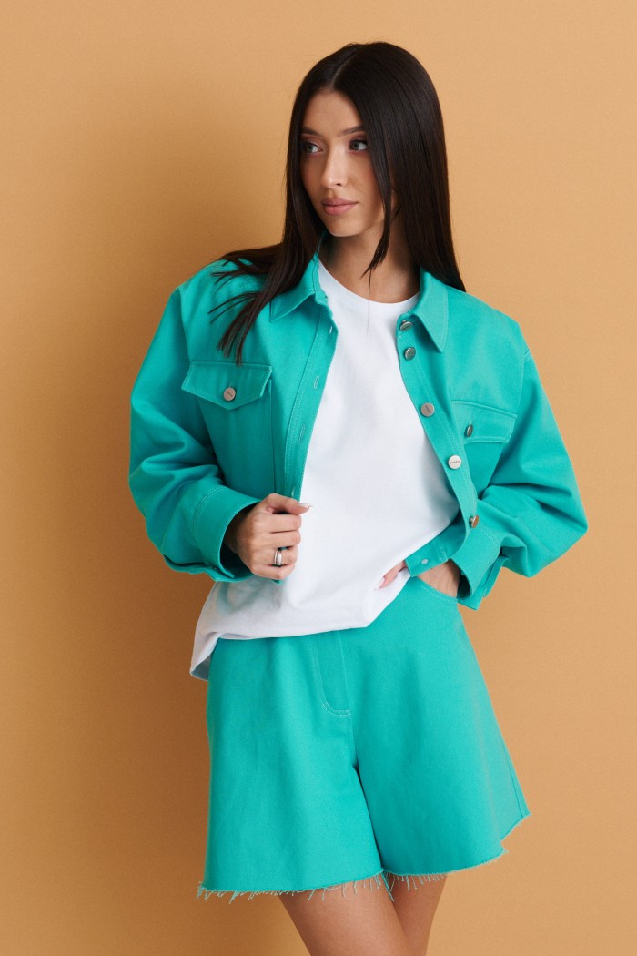 Укороченный жакет выполнен из хлопкового джинсового полотна насыщенного бирюзового цвета.