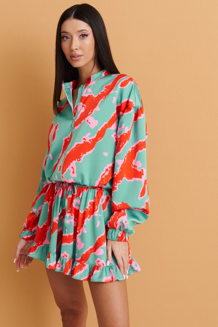Характеристики: укороченный жакет, подкладка, воротник стойка, застежка центральная - металлизированная молния, рукав свободного кроя спущен, низ рукава заканчивается резинкой, спинка цельнокроеная, низ изделия на резинке. Длина по спинке 50 см, длина рукава от края горловины 81 см.