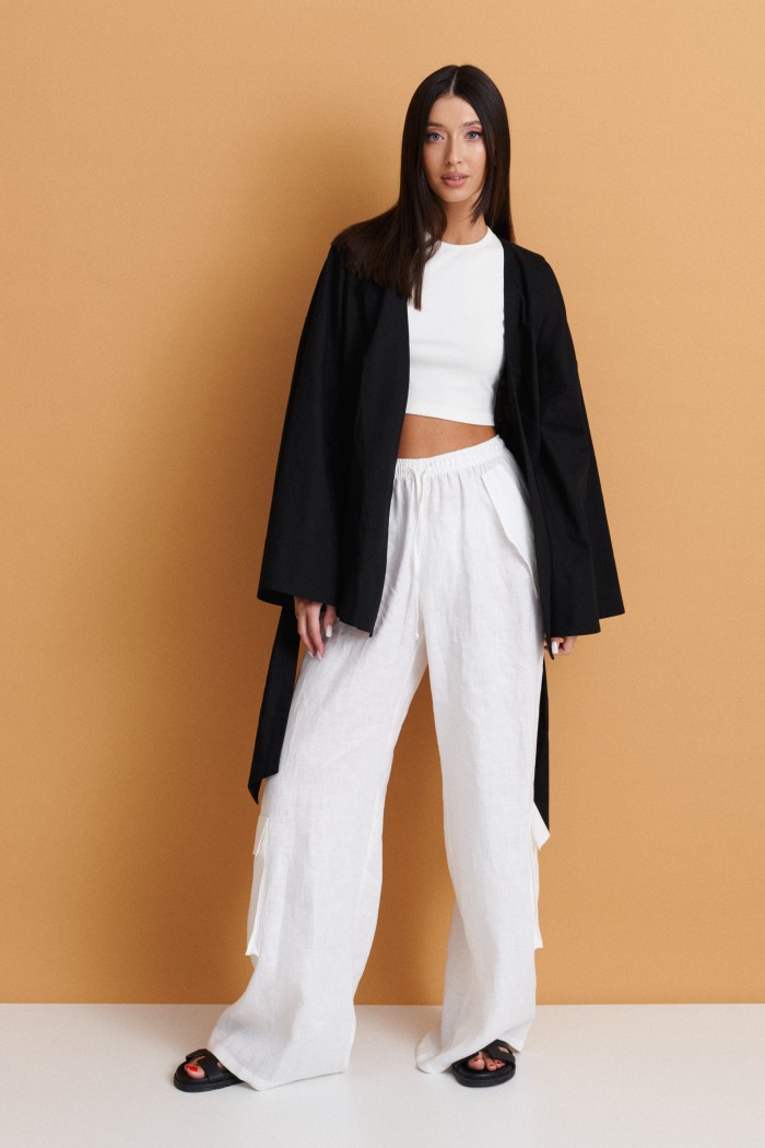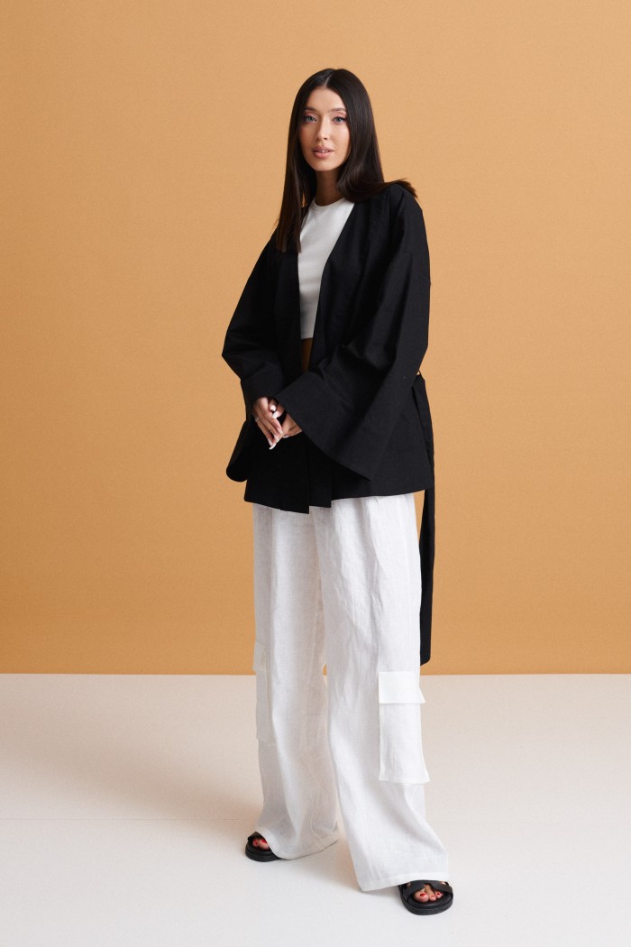Жакет прямого с свободного кроя на запах выполнен из льняного черного полотна.