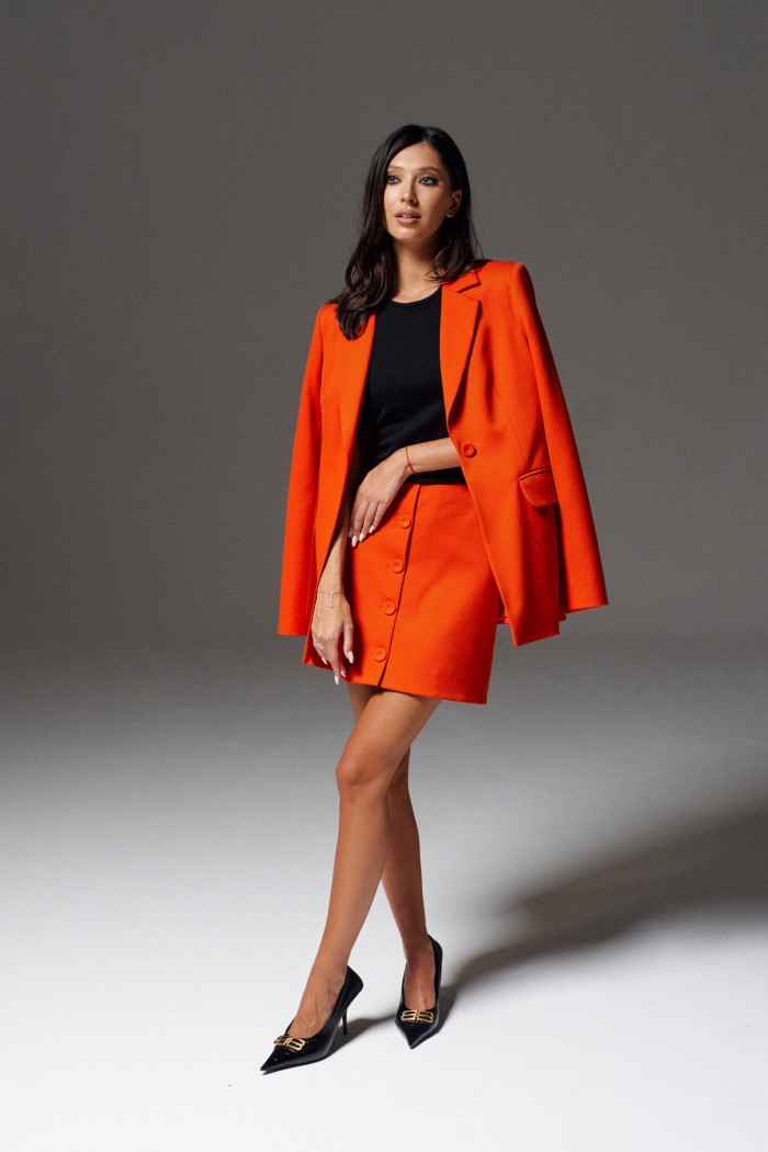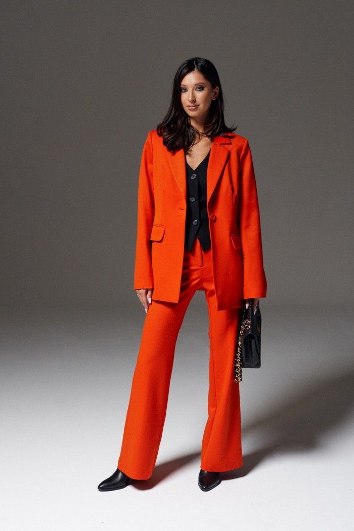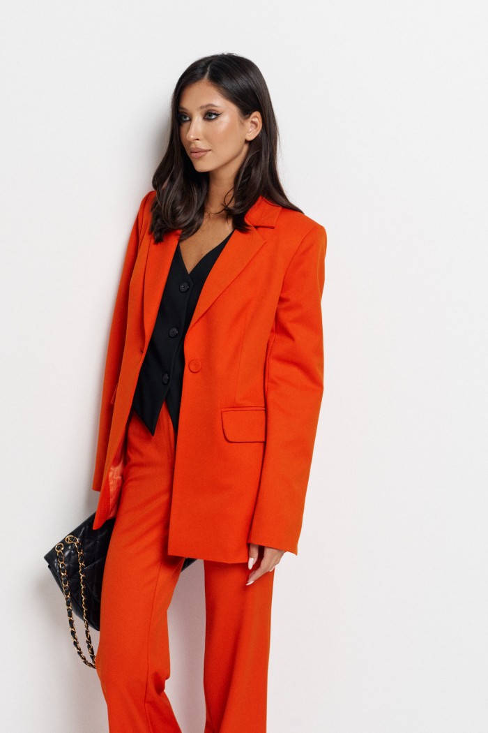 Однобортный жакет полуприлегающего силуэта выполнен из костюмной ткани.