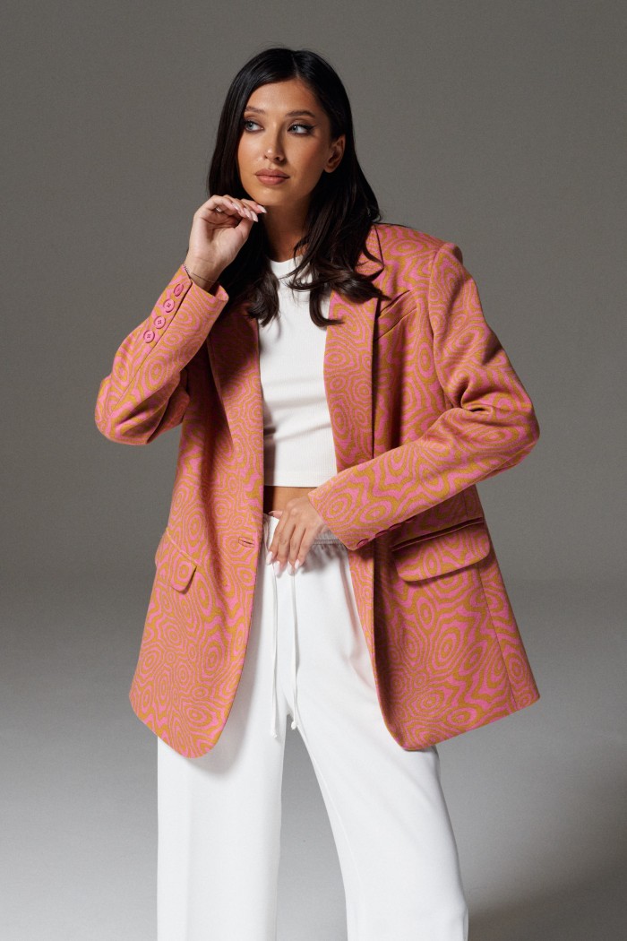 Однобортный жакет прямого свободного кроя выполнен из трикотажной ткани с абстрактным принтом.