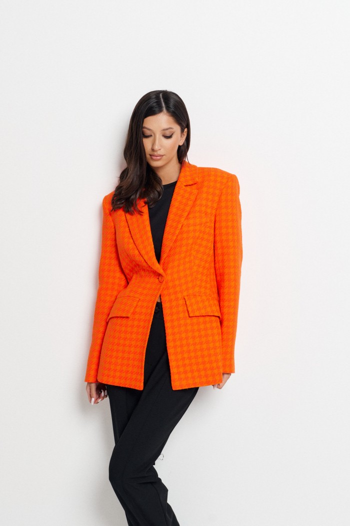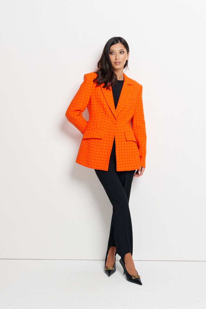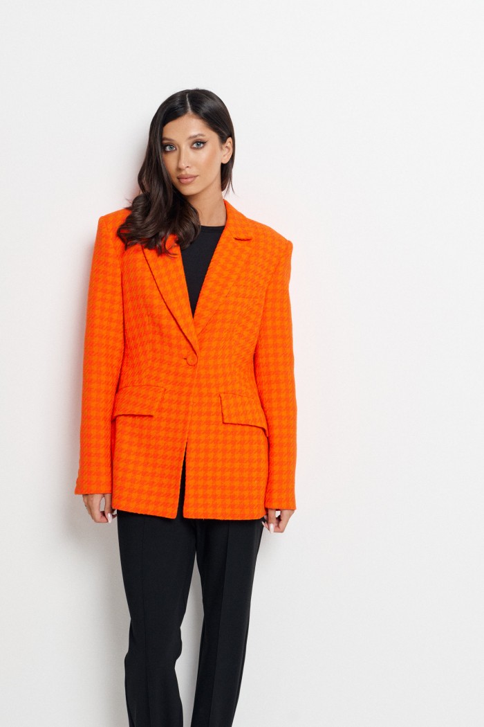 Жакет прилегающего силуэта выполнен из фактурной ткани.