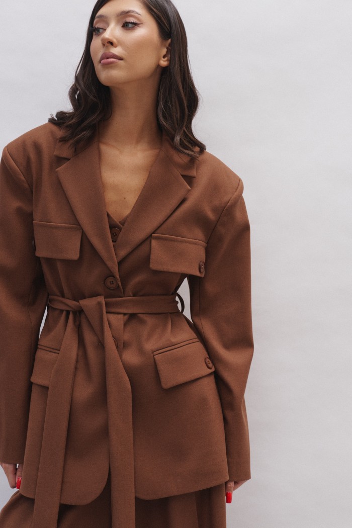 Характеристики: прямой крой, подкладка, подплечники, отложной воротник с остроугольным лацканом, застежка центральная на петли пуговицы, по верхней части изделия карманы обманки, по низу функциональные карманы с клапаном, рукав втачной, по низу рукава нашиты пуговички, по линии талии нашиты шлевки, в комплекте пояс из ткани основного изделия, спинка жакета со средним швом по низу разрез 22 см. Длина по спинке 74 см, длина рукава 62 см.