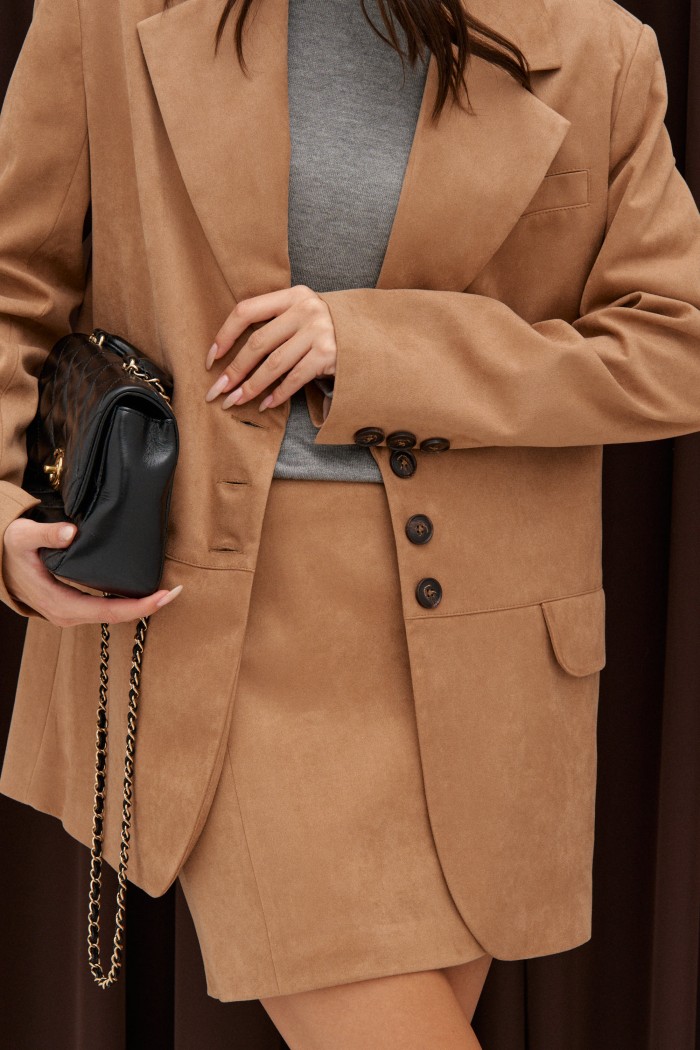 Жакет однобортный. Выполнен из эко-замши светло-коричневого цвета. Прямой крой, горизонтальный подрез ниже линии талии, подклад, разреза в спинке нет. Воротник с остроугольным лацканом. Застёжка контрастные петли-пуговицы. Карманы по переду внизу с клапаном без застёжки (функциональные), по груди карман-листочка (нефункциональный). Рукав втачной, на рукваве контрастные петли-пуговицы (нефункциональные), длина 65 см. Длина спинки жакета 77 см.