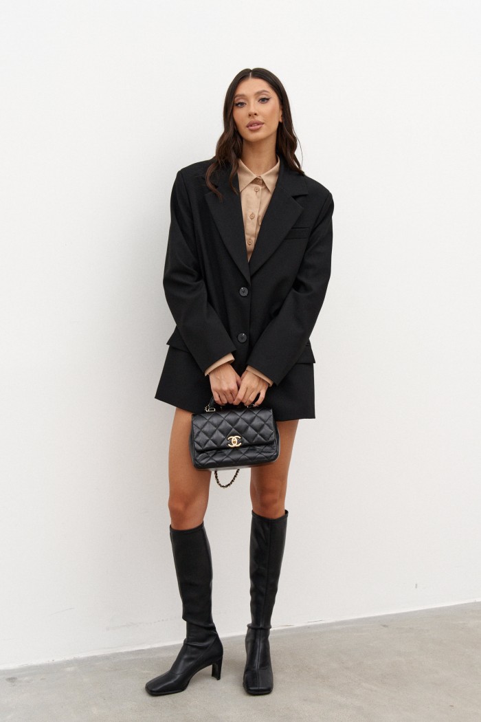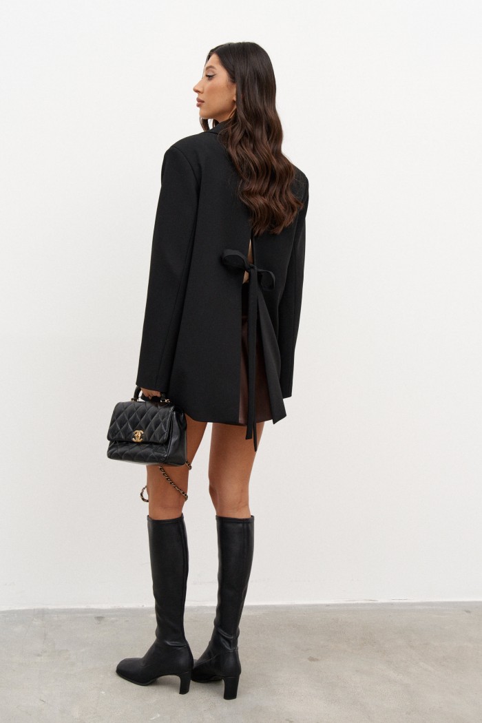 Жакет прямого свободного кроя выполнен из костюмной ткани черного цвета. Характеристики: прямой свободный крой, подкладка, подплечники, воротник с остроугольным лацканом, застежка центральная на петлю - пуговицу, по переду функциональные карманы с клапаном, на груди прорезной карман обманка, рукав втачной, спинка со средним швом, в среднем шве разрез 59 см с завязкой-бантом из ткани основоного изделия. Длина по спинке 76, длина рукава 62 см.
