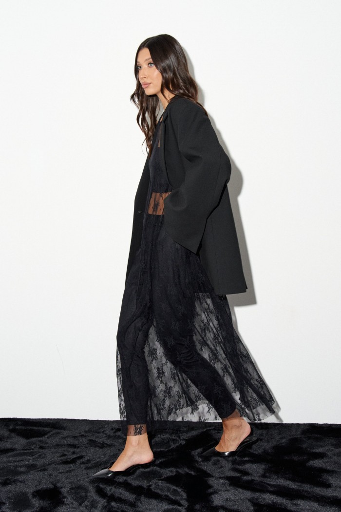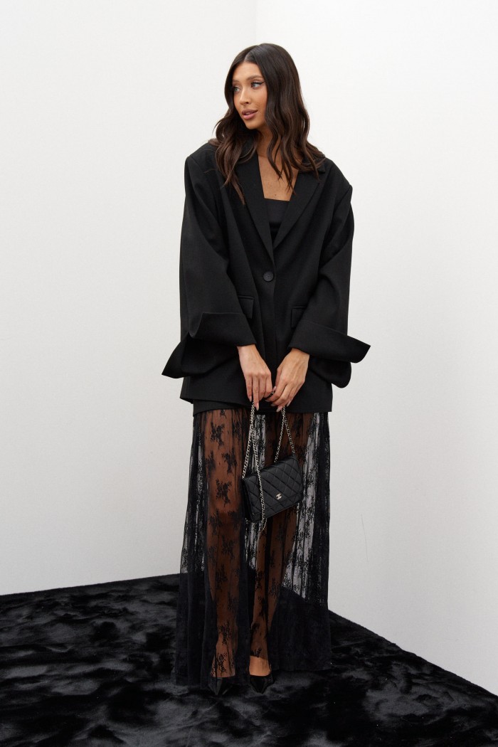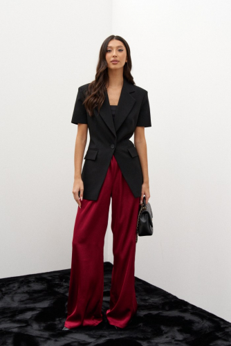 Жакет прямого свободного кроя, выполнен из костюмной ткани черного цвета. Характеристики: широкий прямой крой, отложной воротник с остроугольными лацканами, подкладка, рукав прямой спущеный, по переду изделия карманы в рамку с клапаном, по низу рукава разрез, спинка отрезная с двумя рельефами идущими от плеча до низа, по рельефам шлицы высотой 23 см. Длина по спинке от края горловины 76, длина рукава от края горловины 80 см.