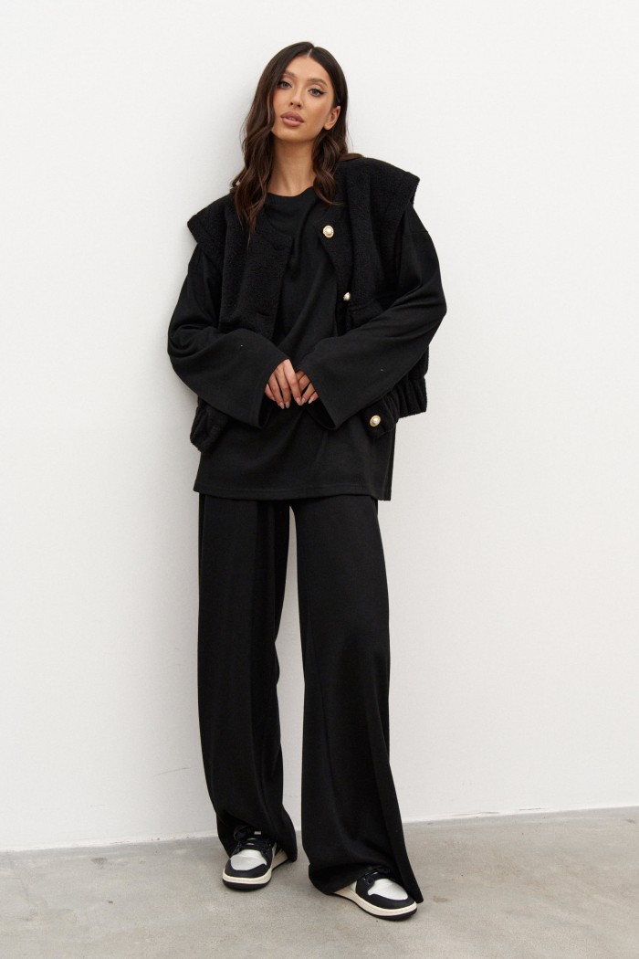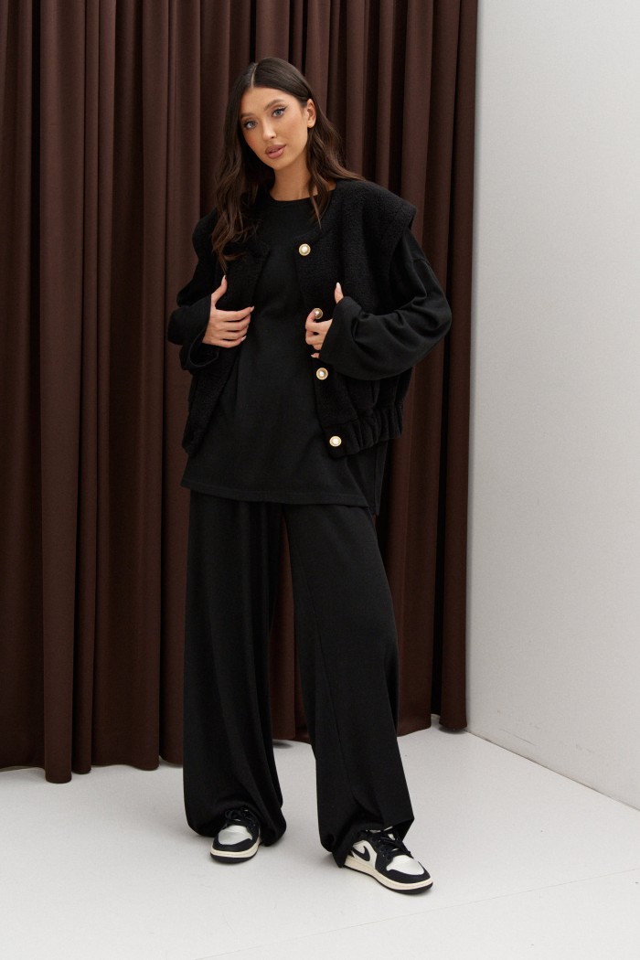 Жилет прямого кроя выполнен из приятного, теплого полотна черного цвета. Характеристики: прямой крой, горловина круглая отстроченная, подкладка, застежка центральная на акцентные петли пуговицы, по переду крупные накладные карманы, низ изделия на резинке. Длина по спинке 53 см.