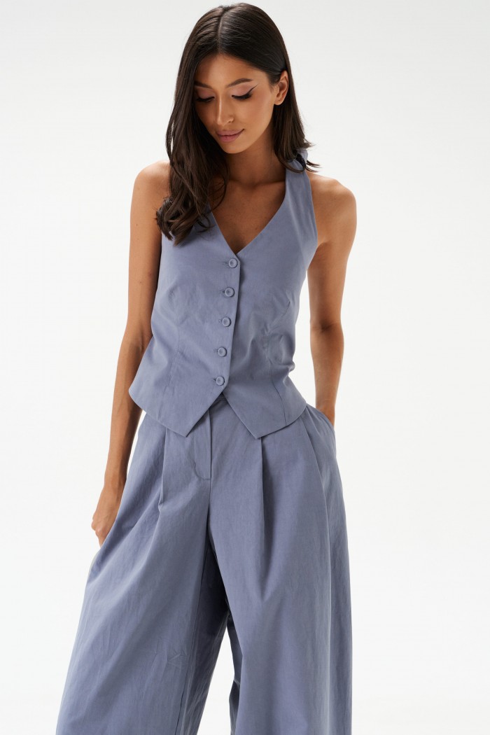 Жилет полуприлегающего силуэта. Выполнен из хлопкового полотна серо-голубого цвета. С подкладкой. Вырез горловины V-образный, переходящий в завязки на спине. Спинка открытая. Низ жилета фигурный. Застёжка центральная – пуговицы. Длина по боковому шву от проймы 24 см. Жилет дополнят брюки А1543
